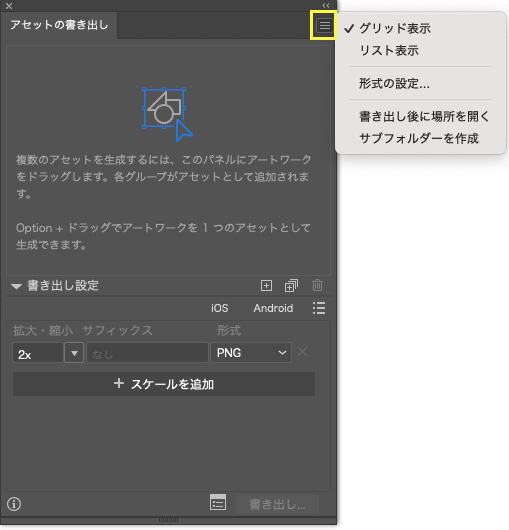 画面中央の横長の黄枠部分は画像形式について設定できます。2倍書き出しの場合は2xでOK、違う場合は再度選択。 画像の書き出しファイル種類を選択。