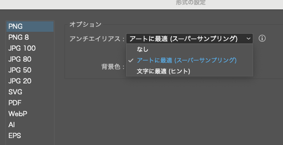 ここで、左のファイル種類を選択後、アンチエイリアスを「アートに最適」を選択します。