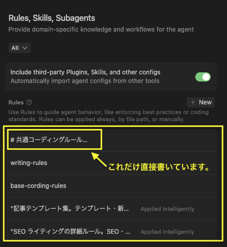Rulesの +Newをクリックして、例えば「日本語で回答してください」「指示されていない変更は行わないでください」といった基本方針を書いておくと便利です。