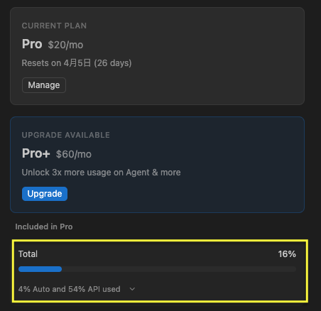 個人やフリーランスの現実的なプランとしてはProプラン(20ドル)かPro+プラン(60ドル)といったところでしょうか?